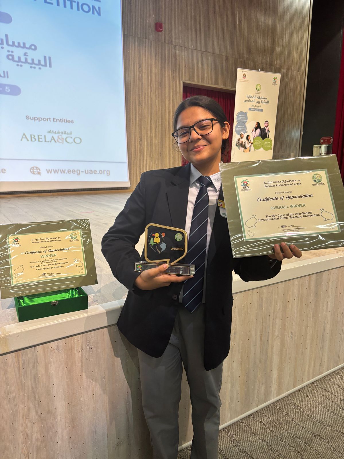 At the Emirates Environmental Group’s 25th Inter-School Environment Public Speaking Competition, I was honored to be named the Day 4 Winner among 25+ schools. My team and I went on to secure the title of Overall Champions, standing out among 120+ schools and over 700 students.