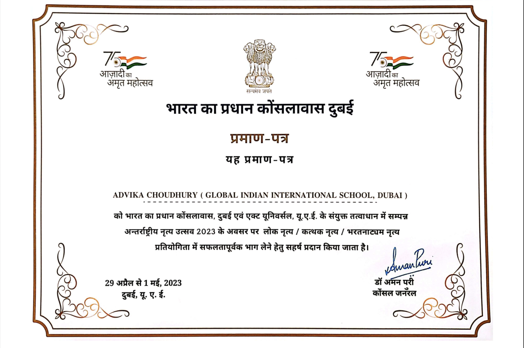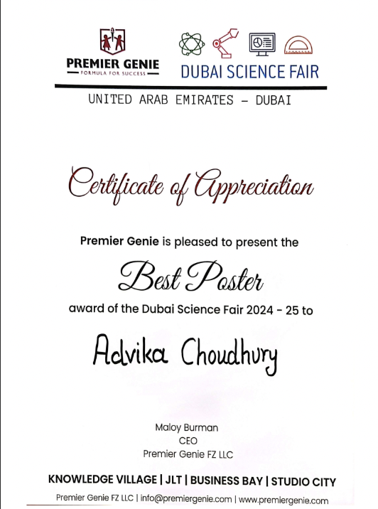In 2023, I had the privilege of representing my school at the Emirates Environmental Group’s Inter-School Public Speaking Competition. Out of a strong field of schools across the UAE, my team and I secured third place — an experience that strengthened both my confidence as a speaker and my belief in the power of collaborative effort.